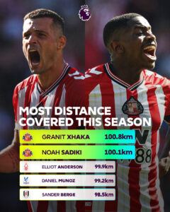 Sipas faqes zyrtare të Ligës Premier, Xhaka ka kaluar 100.8 kilometra në total, me një mesatare mbi 11 kilometra për ndeshje. Pas tij renditet bashkëlojtari i tij Noah Sadiki me 100.1 km, ndërsa Elliot Anderson (Nottingham) me 99.9 km, Daniel Munoz (Crystal Palace) me 99.2 km dhe Sander Berge (Fulham) me 98.5 km kompletojnë pesëshen më të vrapuar. /ATVLIVE.TV