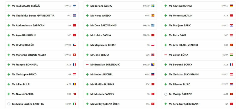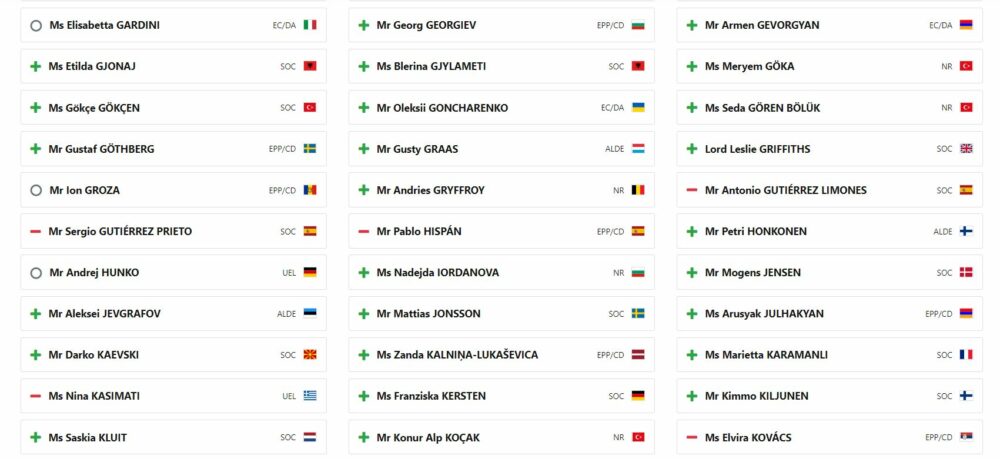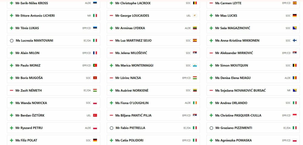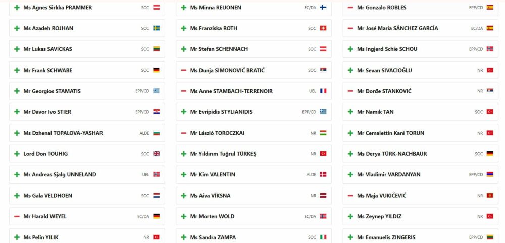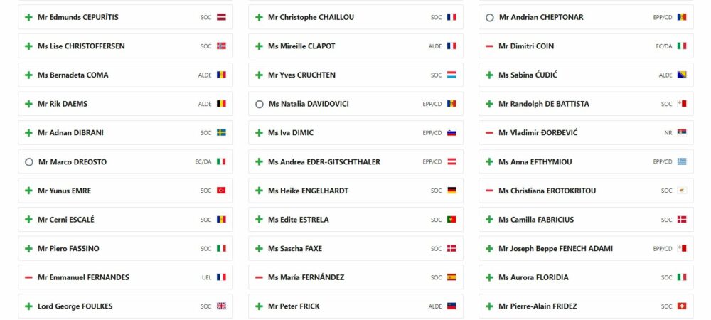 Asambleja Parlamentare e Këshillit të Evropës (PACE) ka publikuar listën e plotë ty vendeve që votuan pro dhe kundër Aplikimit të Kosovës për anëtarësim në Këshillin e Evropës.