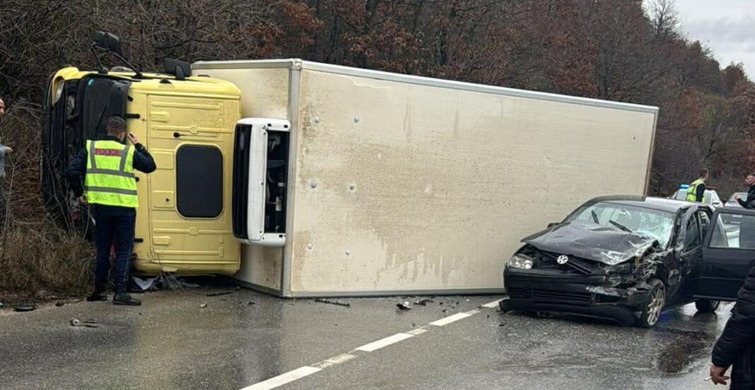Aksident i rëndë në Llaushë të Skenderajt, kamioni përfundon i rrokullisur pas përplasjes me një veturë