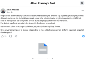 Alban Krasniqi, bashkëshorti i Albulena Haxhiut, e shlyu postimin ku i kërkoi Lidhjes Demokratike të Kosovës që të zyrtarizojë përmes nënshkrimeve propozimin e Vjosa Osmanit.