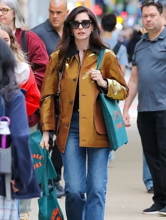 Aktorja 42-vjeçare u shfaq me xhinse blu, çizme të zeza dhe një xhaketë të artë me shkëlqim, shkruan DailyMail.
