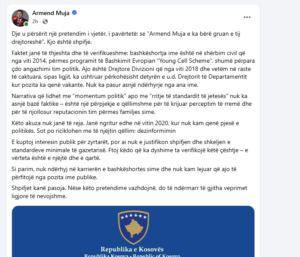 “Dje u përsërit një pretendim i vjetër, i pavërtetë: se “Armend Muja e ka bërë gruan e tij drejtoreshë”. Kjo është shpifje.Faktet janë të thjeshta dhe të verifikueshme: bashkëshortja ime është në shërbim civil që nga viti 2014, përmes programit të Bashkimit Evropian “Young Cell Scheme”, shumë përpara çdo angazhimi tim politik. Ajo është Drejtore Divizioni që nga viti 2018 dhe vetëm në raste të caktuara, sipas ligjit, ka ushtruar përkohësisht detyrën e u.d. Drejtorit të Departamentit kur pozita ka qenë vakante. Nuk ka pasur asnjë ndërhyrje nga ana ime”, ka shkruar Muja në reagim.