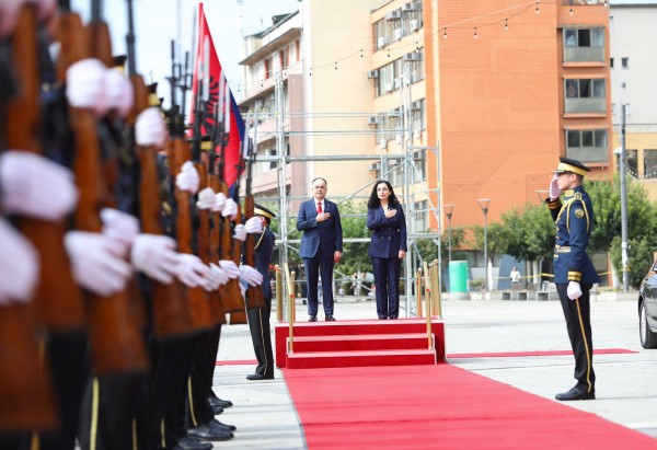Presidentja e vendit, Vjosa Osmani doli për ta pritur Begajn para Presidencës, ku edhe u intonuan himnet shtetërore nga trupat e FSK-së.