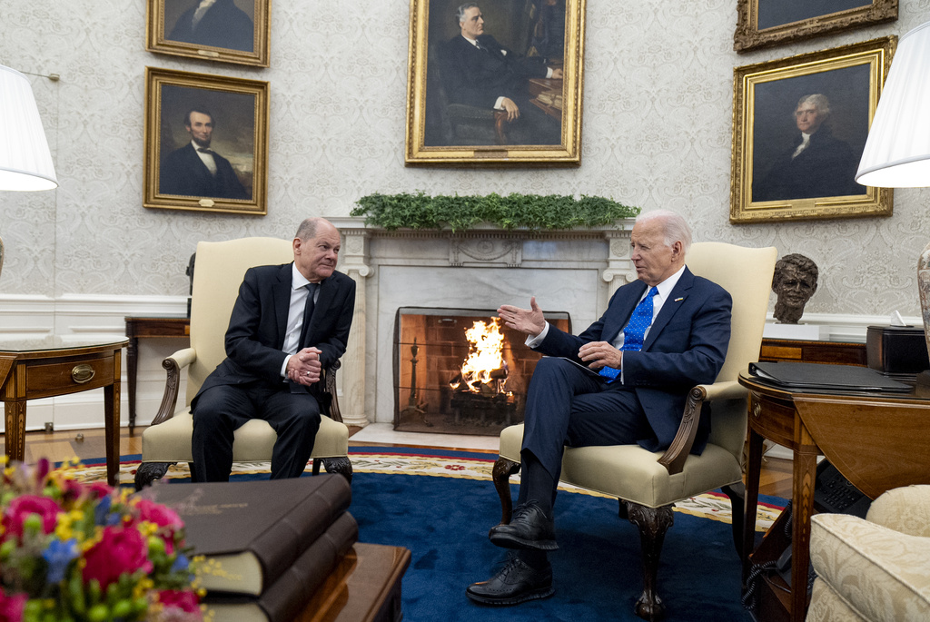 Scholz, i cili ishte në Washington për t’i dhënë mbështetjen e tij përpjekjeve të Bidenit për të marrë fonde për Ukrainën, u takua me presidentin në Shtëpinë e Bardhë për të diskutuar luftën e Rusisë me fqinjin e saj më të vogël si dhe krizën në Lindjen e Mesme.
