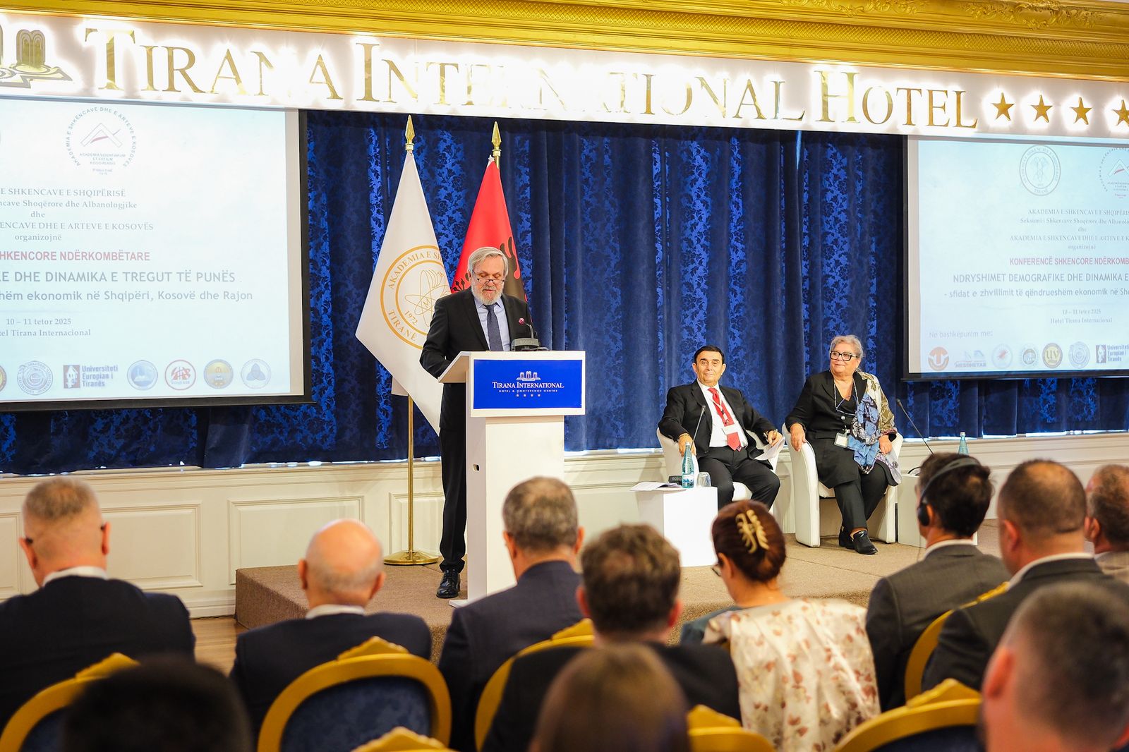 Në emër të Akademisë së Shkencave të Shqipërisë dhe të Kryesisë së saj, konferencën e përshëndeti zëvendëskryetari i Akademisë së Shkencave të Shqipërisë, akad. Vasil S. Tole. Kjo konferencë shkencore, e cila i kushtohet një teme të ndjeshme e me rëndësi strategjike për të ardhmen e vendeve tona dhe të rajonit, ka bërë bashkë dy akademitë tona përmes një bashkëpunimi të ngushtë e të frytshëm, duke i afruar universitetet, studiuesit dhe ekspertët e fushës për të dhënë kontribute shkencore në një çështje kaq madhore. Në dekadat e fundit, realiteti demografik i Shqipërisë, Kosovës dhe rajonit tonë ka ndryshuar rrënjësisht. Popullsia është në tkurrje, ritmet e lindshmërisë janë ulur, emigracioni masiv i të rinjve ka sjellë boshatisjen e shumë zonave dhe humbjen e potencialeve të vlefshme njerëzore. Ai e vlerësoi konferencën si një dëshmi të përkushtimit të përbashkët për të vendosur dijen dhe kërkimin shkencor në shërbim të shoqërisë. Përballë sfidave të sotme, akademitë nuk janë vetëm institucione të traditës, por edhe institucione të rëndësishme rekomanduese e këshilluese, që me rolin e tyre shërbejnë si ura mes shkencës dhe politikës, mes dijes dhe vendimmarrjes. Kjo është një praktikë që e gjejmë në të gjitha vendet europiane dhe që po bëhet gjithnjë e më shumë pjesë e vizionit tonë për akademinë si partner strategjik të shtetit dhe të shoqërisë. Ne jemi të vetëdijshëm se përmasat e sfidave demografike e ekonomike janë të tilla që nuk mund të adresohen vetëm nga një vend apo nga një institucion i vetëm. Ato kërkojnë një qasje të koordinuar, një dialog rajonal dhe një bashkëpunim të vazhdueshëm me partnerët ndërkombëtarë.