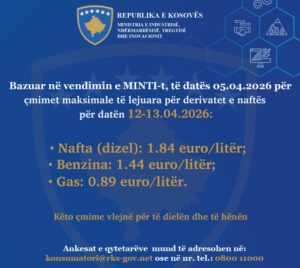 Ministria e Industrisë, Ndërmarrësisë dhe Tregtisë e Kosovës (MINT) ka bërë të ditur çmimet maksimale të lejuara për derivatet e naftës, të cilat do të jenë në fuqi për datën 13 prill 2026.