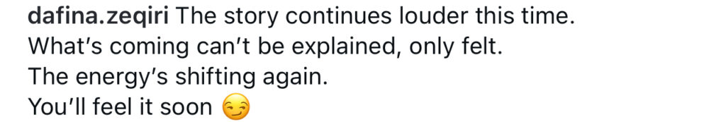 “Historia vazhdon më me zë këtë herë. Ajo që po vjen nuk mund të shpjegohet, vetëm të ndjehet. Energjia po ndryshon përsëri. Do ta ndjeni së shpejti”, ka shkruar ajo në Instagram.