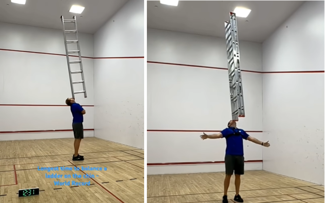 David Rush, mbajtësi i më së shumti titujve të njëkohshëm të Rekordeve Botërore Guinness, ka vendosur një rekord të ri të jashtëzakonshëm duke balancuar një shkallë në mjekër për 19 minuta e 11 sekonda.