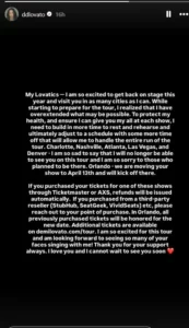 Në një postim në Instagram Story, Lovato tha se mezi pret të kthehet në skenë dhe të takohet me fansat në qytete të shumta si pjesë e turneut “It’s Not That Deep”. Megjithatë, ajo pranoi se gjatë përgatitjeve e kuptoi se kishte marrë më shumë përgjegjësi sesa mund të përballonte në këtë moment.