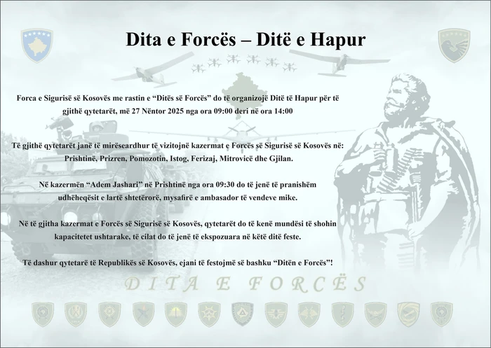 Forca e Sigurisë së Kosovës bën të ditur se të enjten, më 27 nëntor organizon Ditën e Forcës-Ditë e hapur nga ora 09:00 deri në ora 14:00.