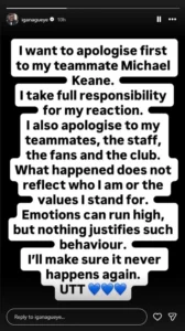 “Së pari, do të doja t’i kërkoja falje shokut tim të skuadrës Michael Keane”, shkroi fillimisht Gueye.