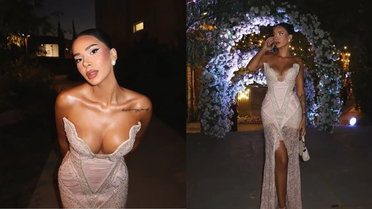 Ajo zgjodhi një fustan të gjatë ngjyrë rozë të zbehtë, i punuar me dantellë dhe detaje të zbukuruara me perla, i cili theksonte linjat e saj dhe i jepte një pamje madhështore.