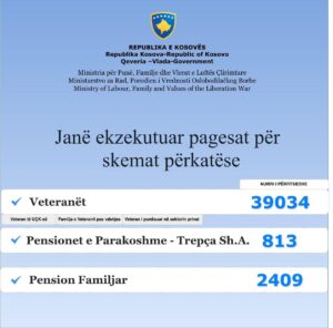 Ministria për Punë, Familje dhe Vlerat e Luftës Çlirimtare ka njoftuar se janë ekzekutuar pagesat për disa skema përkatëse.