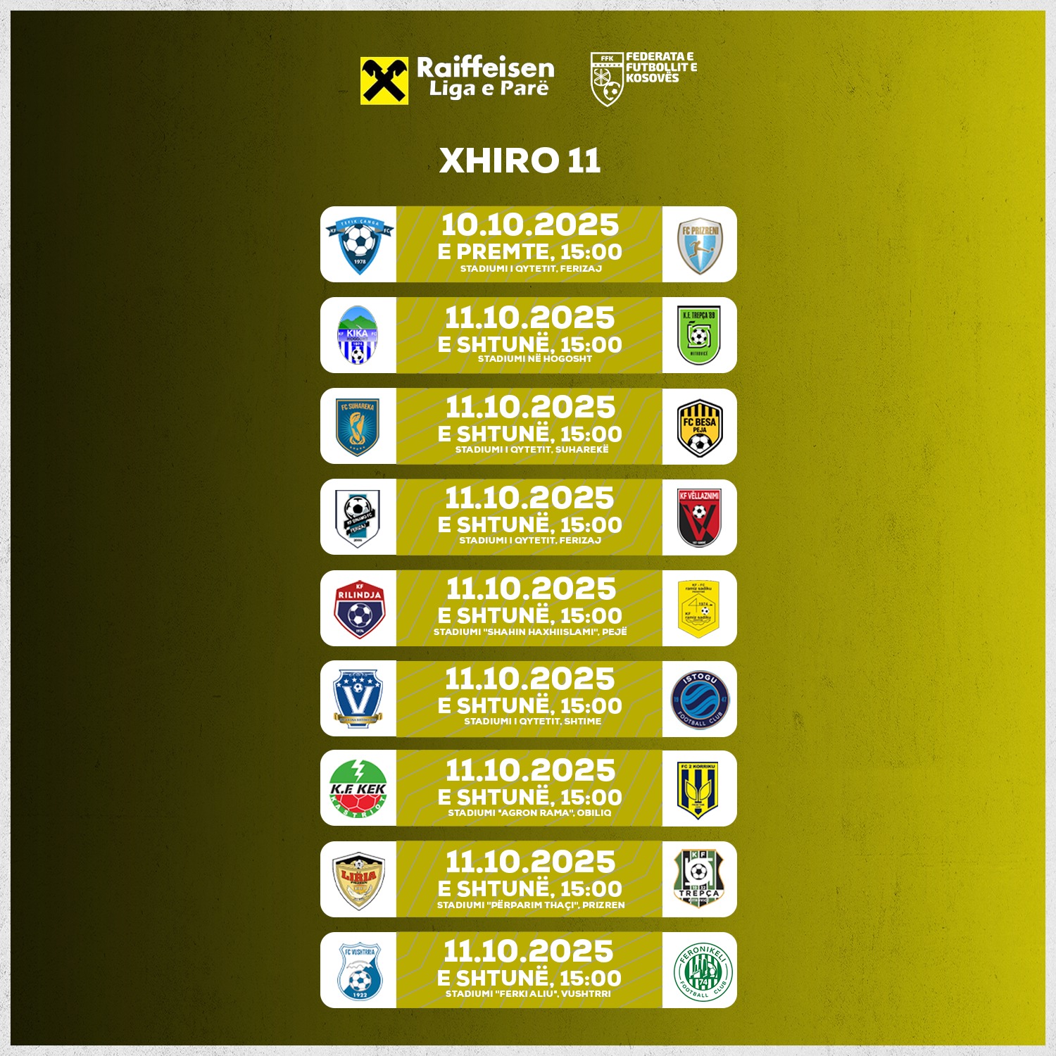 Federata e Futbollit të Kosovës ka publikuar orarin e ndeshjeve të Raiffeisen Ligës së Parë në xhiron e 11.