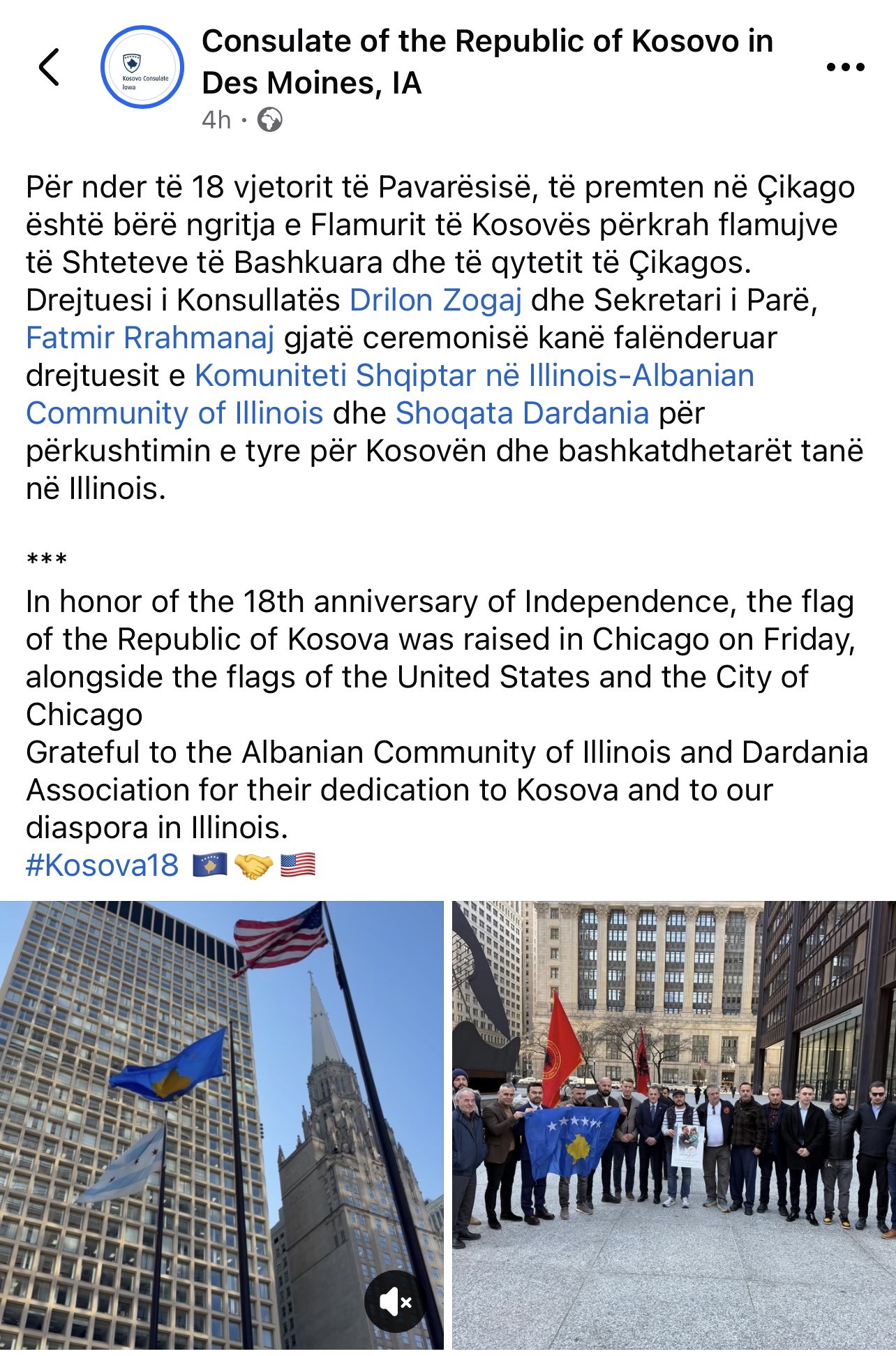 Për nder të 18-vjetorit të Pavarësisë së Kosovës, të premten në Chicago është bërë ngritja solemne e Flamurit të Kosovës përkrah flamurit të Shteteve të Bashkuara të Amerikës dhe atij të qytetit të Çikagos.