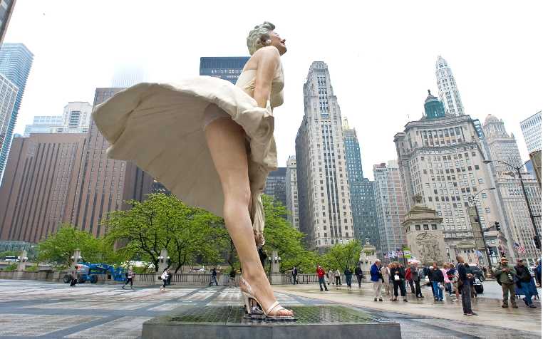 Statuja, e modeluar sipas skenës ikonike nga filmi “The Seven Year Itch”, e paraqet yllin e Hollivudit duke qëndruar mbi një rrjetë ajrimi në trotuar, ndërsa fustani i bardhë i ngrihet nga era. E vendosur në një shesh publik, vepra synon të festojë një nga imazhet më të famshme të kulturës pop.
