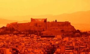 Greqia është përfshirë nga një fenomen apokaliptik moti, ku stuhia e rërës afrikane po përplaset me rrymat që sjellin erëra të forta, stuhi shiu dhe dallgë detare.
