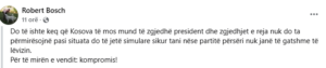 “Do të ishte keq që Kosova të mos mund të zgjedhë president dhe zgjedhjet e reja nuk do ta përmirësojnë pasi situata do të jetë simulare sikur tani nëse partitë përsëri nuk janë të gatshme të lëvizin. Për të mirën e vendit: kompromis!”, ka shkruar ai ndër të tjera.