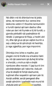 Sot, Ardita Hasani Haziri ka publikuar një reagim në rrjetet sociale, ku thotë se asaj nuk iu lejua të mbante një fjalë lamtumire në ceremoninë mortore të ish-bashkëshortit.