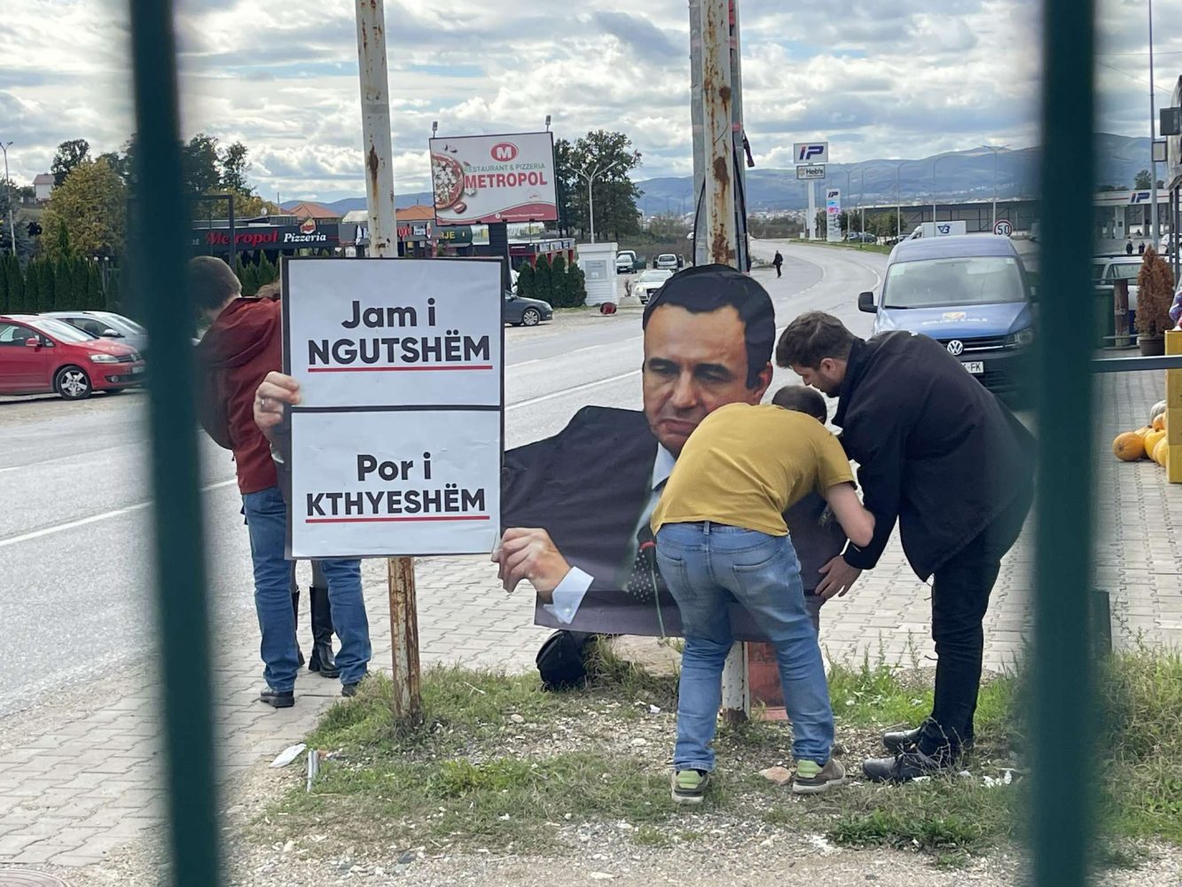 Më pas ata kanë vendosur një pankartë me fotografinë e kryeministrit Albin Kurti me një mbishkrim “Jam i ngutshëm, por i kthyeshëm”.