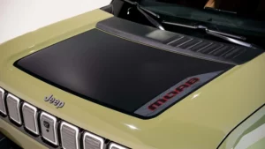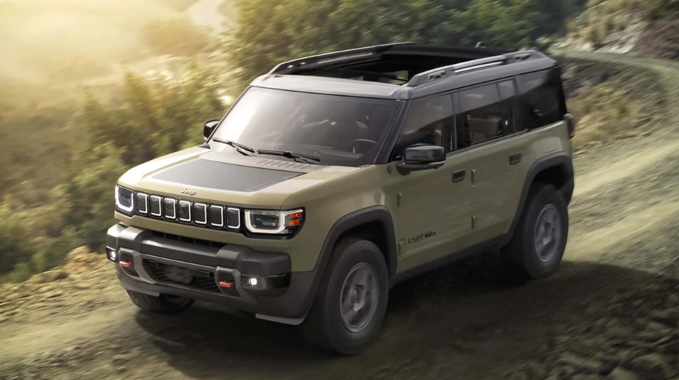 Ndërsa mund të mos ketë një motor me djegie nën kapakun e motorit, grila me shtatë vrima e Jeep mbetet, me secilën prej tyre të ndriçuar. Dritat LED të ditës në formë U-je kornizojnë dritat LED.