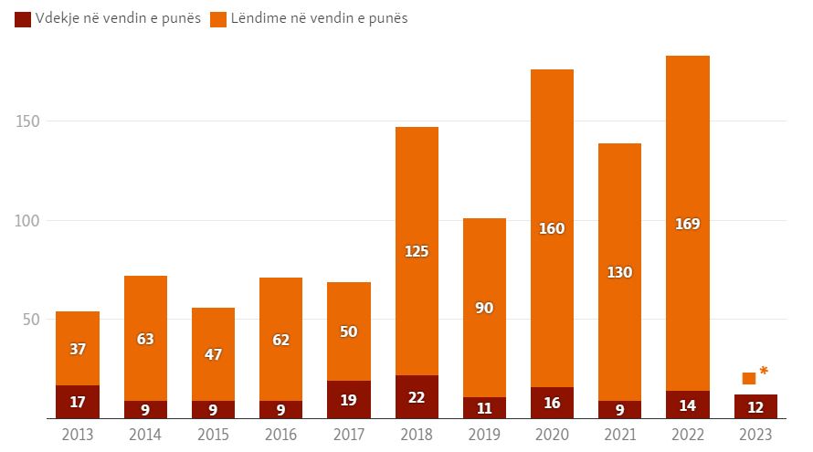 “Nga ky numër, pesë raste nga Inspektorati janë cilësuar vdekje si rezultat i drejtpërdrejtë i ushtrimit të veprimtarisë së punës dhe shtatë raste të tjera nuk lidhen me ushtrimin e veprimtarisë së punës”, thuhet në përgjigjen e Inspektoratit të Punës dërguar Radios Evropa e Lirë.