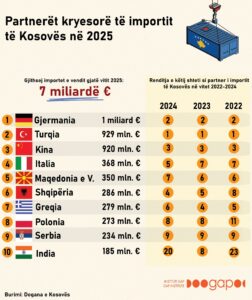 Kosova importoi më së shumti mallra nga 20 partnerë në vitin 2025, në mesin e këtyre shteteve Serbia renditet e 9-ta, pavarësisht marrëdhënieve të tensionuar politike mes dy vendeve, ajo vazhdon të jetë një nga partnerët kryesore tregtare të shtetit.