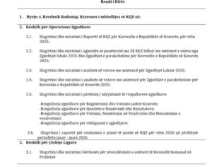 Në kuadër të këshillit për operacione zgjedhore, anëtarët do të shqyrtojnë dhe miratojnë raportin vjetor të KQZ-së për vitin 2025, i cili më pas i dërgohet Kuvendit të Republikës së Kosovës.