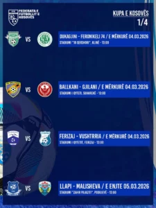 Federata e Futbollit të Kosovës (FFK) ka zyrtarizuar orarin e çerekfinaleve të Kupës së Kosovës, të cilat zhvillohen këtë javë dhe premtojnë emocion, rivalitet dhe shumë luftë në fushë. Sot (e mërkurë) luhen tri ndeshje, ndërsa njëra sfidë zhvillohet nesër (e enjte).