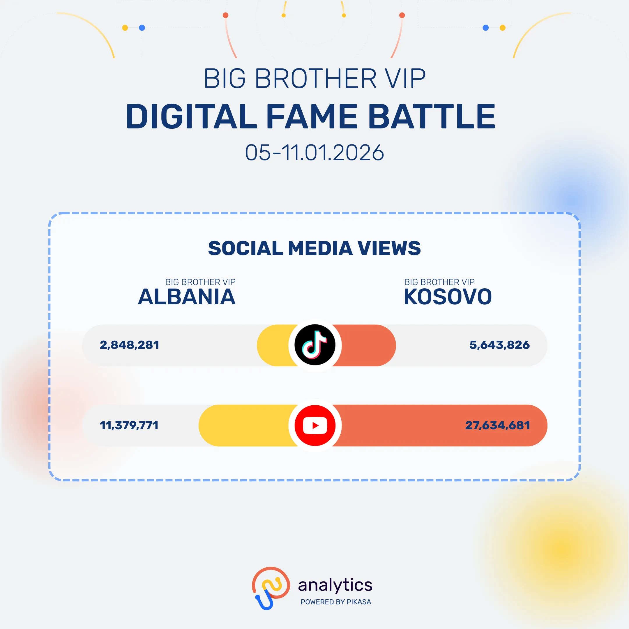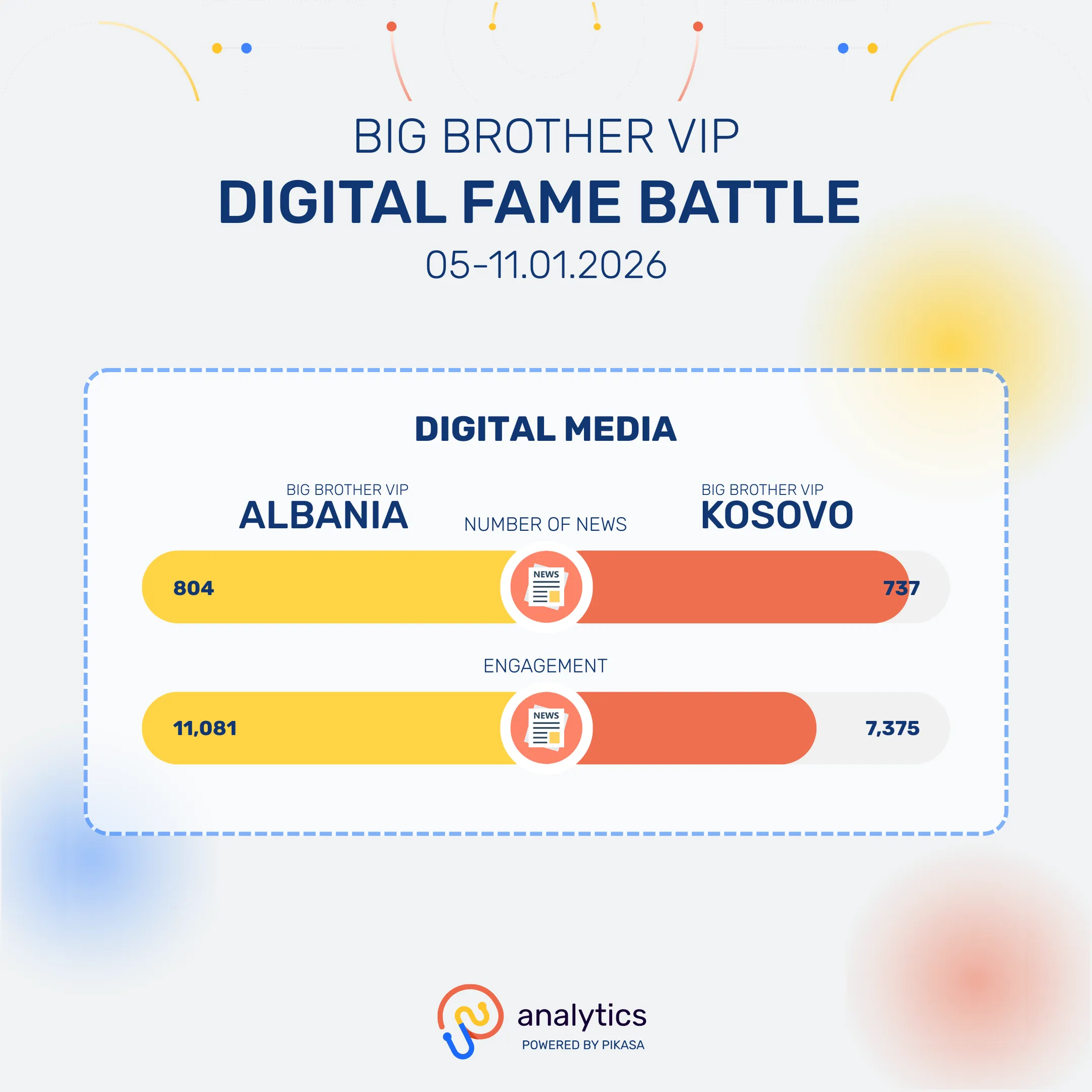Përmes platformës së saj të inteligjencës mediatike në kohë reale, analytics.live, Pikasa ka analizuar praninë online dhe ndikimin mediatik të Big Brother VIP Albania dhe Big Brother VIP Kosova, duke përfshirë kanalet zyrtare në rrjete sociale dhe mbulimin nga mediat në të dy shtetet.