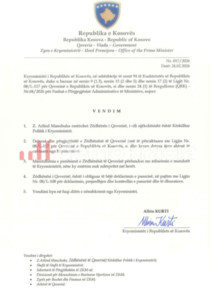 “Kryeministri i Republikës së Kosovës, në mbështetje të nenit 94 të Kushtetutës së Republikës së Kosovës, duke u bazuar në nenin 9 (1.3), nenin 13 (2 dhe 5) dhe nenin 17 (2) të Ligjit Nr. 08/L-117 për Qeverinë e Republikës së Kosovës, si dhe nenin 24 (1) të Rregullores (QRK) Nr.04/2026 për Fushat e Përgjegjësisë Administrative të Ministrive, nxjerr: Z. Arlind Manxhuka emërohet Zëdhënës i Qeverisë, i cili njëkohësisht është Këshilltar Politik i Kryeministrit”, thuhet në vendimin e qeverisë të publikuar nga Demokracia.