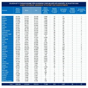 Numri i qytetarëve me të drejtë vote në vendvotime në Kosovë është 1 milion e 999 mijë e 205, ndërkaq numri i qytetarëve që janë regjistruar për të votuar jashtë Kosovës është 77 mijë e 85 votues. Kjo listë përmban 7 mijë e 192 votues më shumë se në zgjedhjet lokale më 12 tetor 2025.