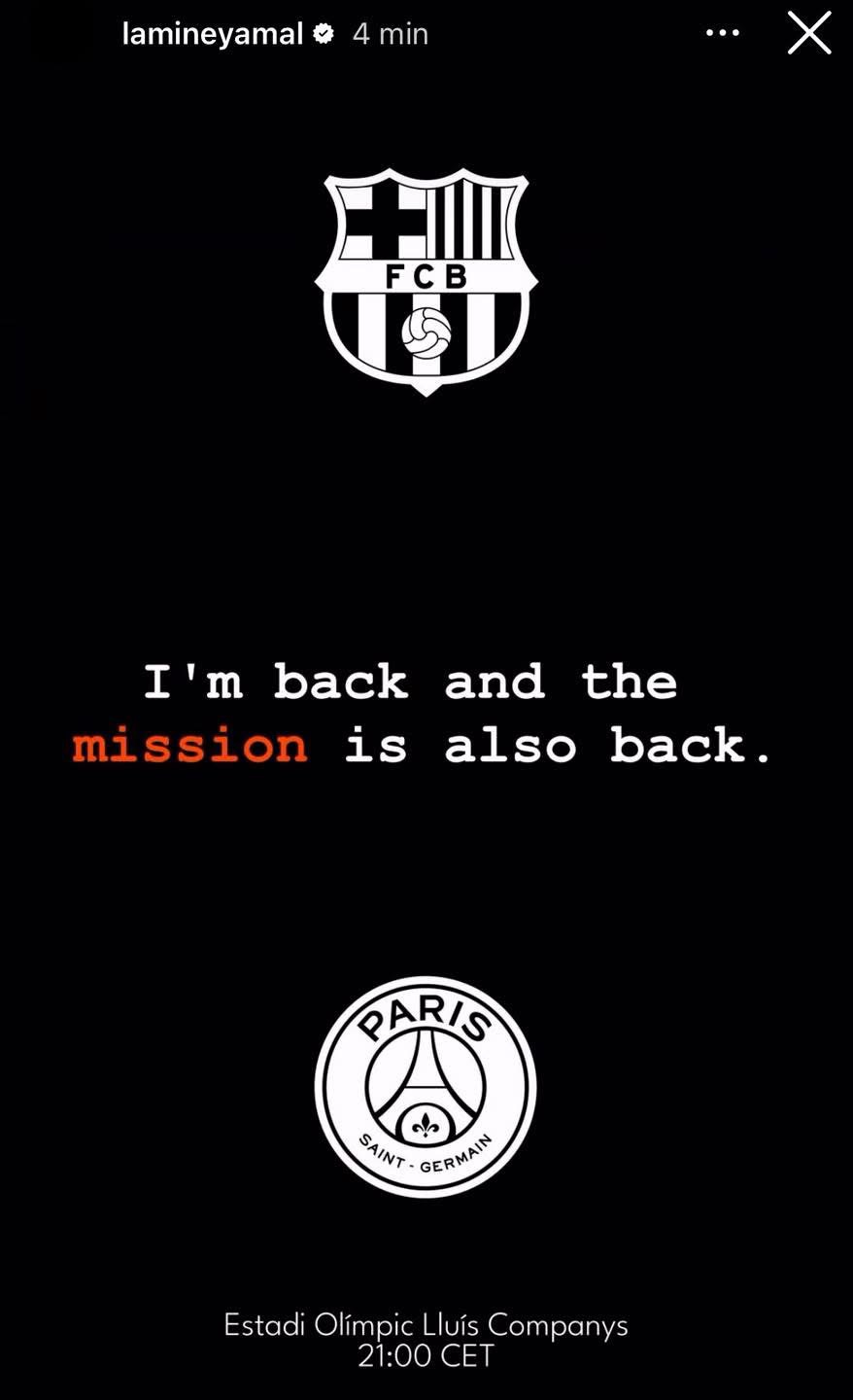 Lamine Yamal ka zgjedhur rrjetet sociale për të dhënë një sinjal të qartë mbi rikthimin e tij. Ylli i ri i Barcelonës, vetëm 16-vjeçar, ka publikuar një postim në Instagram me fjalët: “I’M BACK AND THE MISSION IS ALSO BACK” (“Jam kthyer dhe misioni ka nisur sërish”), duke ndezur menjëherë entuziazmin e tifozëve katalanas.