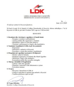 LAJME LDK sot mban mbledhjen e kryesisë, nominon kandidatin për kryeministër By K.B. 24 November, 2025 - 08:19 Share FacebookTwitterPinterestWhatsApp Lidhja Demokratike e Kosovës sot pritet të caktojë kandidatin për kryeministër për zgjedhjet e 28 dhjetorit. Mbledhja e Kryesisë së LDK-së do të nisë nga ora 15:00. Si pikë e dytë e rendit të ditës është edhe nominimi i kandidatit të LDK-së për kryeministër. Klikoni KËTU për t’u bërë pjesë e kanalit zyrtar të ATVLIVE.TV në Viber. Bëni Subscribe në kanalin zyrtar të ATV-së në YouTube – Kliko KËTU Share FacebookTwitterPinterestWhatsApp LAJME TË TJERA Belgjika paralizohet nga greva tre-ditore 24 November, 2025 - 09:26 Fushë Kosovë: Burri ua vë flakën orendive dhe ikë nga banesa, Policia jep detaje 24 November, 2025 - 09:08 Shtatë muaj pasi u aksidentua, vdes në spital një person 24 November, 2025 - 09:03 Bashkëjetoi me të mitur, arrestohet i dyshuari në Obiliq 24 November, 2025 - 08:50 Your browser does not support the video tag. PUBLIKUAR SË FUNDI Beyonce dhe Jay-Z marrin vëmendjen prej formulave në “Grand Prix” L.P - 24 November, 2025 - 09:28 Belgjika paralizohet nga greva tre-ditore K.B. - 24 November, 2025 - 09:26 Vendi misterioz në mes të asgjëkundit ku sinjali i radios humbet dhe busullat prishen K.B. - 24 November, 2025 - 09:18 Ariana Grande me COVID19, vëllau i saj jep detaje për gjendjen e saj shëndetësore L.P - 24 November, 2025 - 09:13 Burri fiton miliona në lotari por e fsheh nga gruaja – ja çfarë ndodhi më pas K.B. - 24 November, 2025 - 09:12 Fushë Kosovë: Burri ua vë flakën orendive dhe ikë nga banesa, Policia jep detaje K.B. - 24 November, 2025 - 09:08 Shtatë muaj pasi u aksidentua, vdes në spital një person K.B. - 24 November, 2025 - 09:03 LAJME TË TJERA Belgjika paralizohet nga greva tre-ditore 24 November, 2025 - 09:26 Fushë Kosovë: Burri ua vë flakën orendive dhe ikë nga banesa, Policia jep detaje 24 November, 2025 - 09:08 Shtatë muaj pasi u aksidentua, vdes në spital një person 24 November, 2025 - 09:03 Bashkëjetoi me të mitur, arrestohet i dyshuari në Obiliq 24 November, 2025 - 08:50
