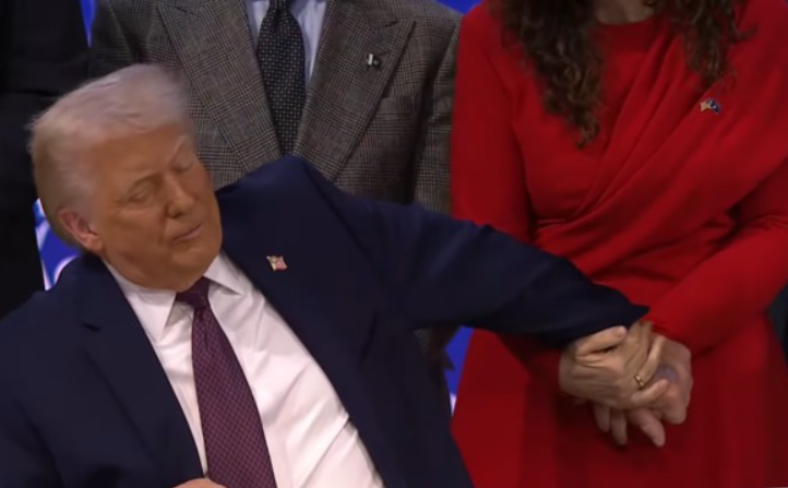 Me liderët pjesëmarrës prapa, Trump hodhi nënshkrimin dhe më pas u kthye duke ia kapur dorën presidentes së Kosovës, Vjosa Osmani, e cila u rreshtua menjëherë pas tij.