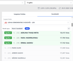 Guri ka rreth 400 vota më pak se Ermal Sadiku i cili renditet i 15-ti dhe është kandidati i fundit që hyn në Kuvendin e Kosovës nga radhët e LDK-së.