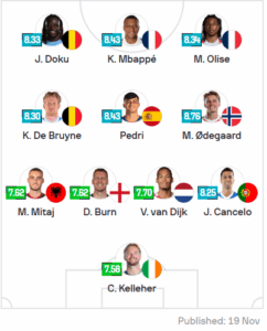 Mario Mitaj është një nga futbollistët që u vlerësua nga “SofaScore” për paraqitjet e tij me Kombëtaren shqiptare. Talenti i kuqezinjve u zgjodh në formacionin më të mirë të kualifikueseve, duke u vendosur pranë yjeve europianë si Kevin De Bruyne dhe Kylian Mbappé.