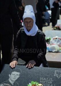 Vase Tahiraj, u pa teksa qëndronte para varrit të djalit të saj të vetëm, Halil Miftar Tahiraj, një nga viktimat e kësaj masakre.