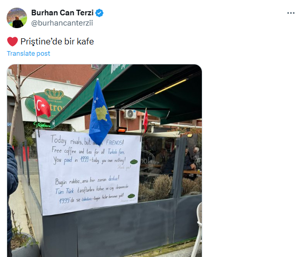 Ky mesazh kujton periudhën e Luftës së Kosovës, kur Turqia qëndroi pranë popullit kosovar në momentet më të vështira. Pronari i lokalit, përmes këtij gjesti, dëshiron të shprehë mirënjohje dhe të forcojë lidhjen historike mes dy popujve, duke treguar se respekti dhe solidariteti mund të qëndrojnë përtej rivalitetit sportiv.