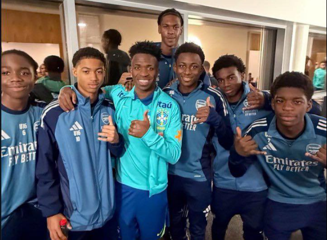 Një moment i veçantë ka ndodhur gjatë një seance stërvitore, ku lojtarët e rinj të Arsenalit nuk mund të mos ndalojnë sulmuesin brazilian të Real Madrid, Vinicius Jr, për të bërë një selfie grupi.