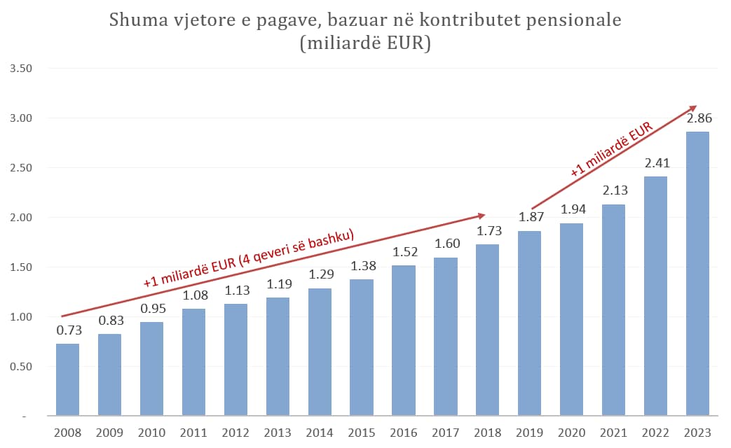 Rritja më e madhe brenda një viti ka ndodhur në vitin 2023, ku janë shtuar 450 milionë euro më shumë paga sesa viti 2022. Nga kjo shumë, rreth 114 milionë euro (17% rritje) janë shtuar nga rritja e pagave në sektorin publik si rezultat i hyrjes në fuqi të ligjit të pagave, kurse pjesa tjeter e rritje vjen nga sektori privat, kryesisht nga shtimi i vendeve të punës por edhe rritja e pagave për ato ekzistuese.
