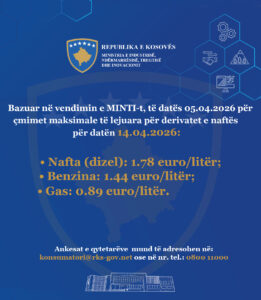 Ministria e Industrisë, Ndërmarrësisë dhe Tregtisë e Kosovës (MINT) ka bërë të ditur çmimet maksimale të lejuara për derivatet e naftës, të cilat do të jenë në fuqi për datën 14 prill 2026.