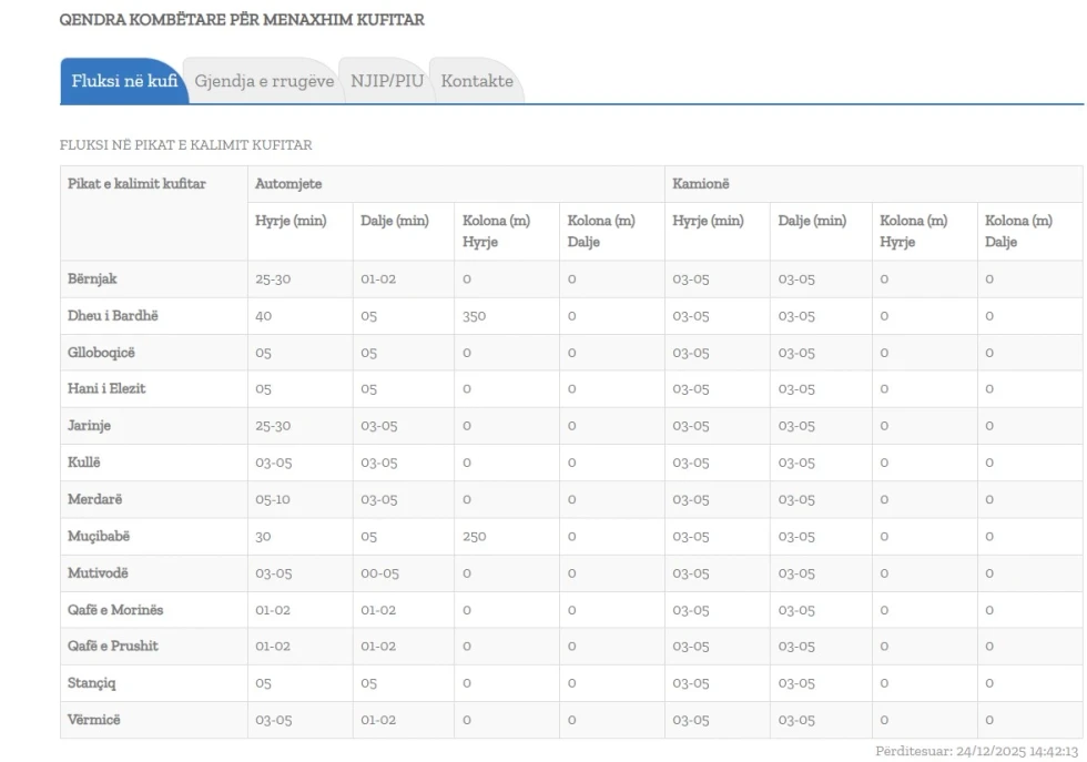 Qendra Kombëtare për Menaxhim Kufitar ka publikuar përditësimin e fundit për gjendjen në kufi, të bërë pas orës 14:40, ku ka treguar se pritjet për të hyrë në Kosovë nëpërmjet pikës kufitare Dheu i Bardhë janë 40 minuta.