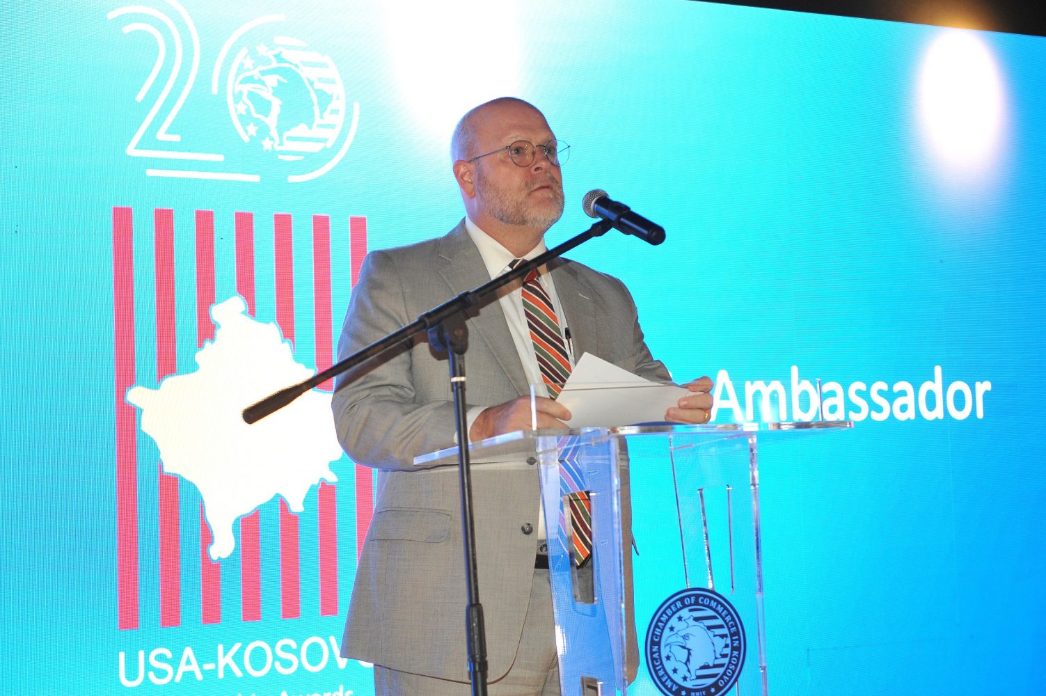 Ambasadori i Shteteve të Bashkuara të Amerikës në Kosovë, Jeffrey Hovenier, iu drejtua anëtarëve, partnerëve dhe pranuesve të mirënjohjeve, duke theksuar rëndësinë e partneritetit SHBA-Kosovë.