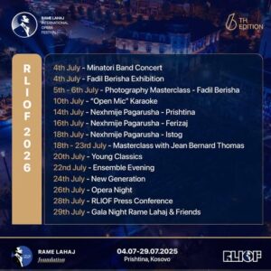 Edicioni i gjashtë i Rame Lahaj International Opera Festival vjen këtë vit si një udhëtim artistik që përshkon gjithë muajin korrik, duke e kthyer Prishtinën dhe Kosovën në një hapësirë takimi mes zërave, kujtesës, emocioneve dhe bukurisë së artit.