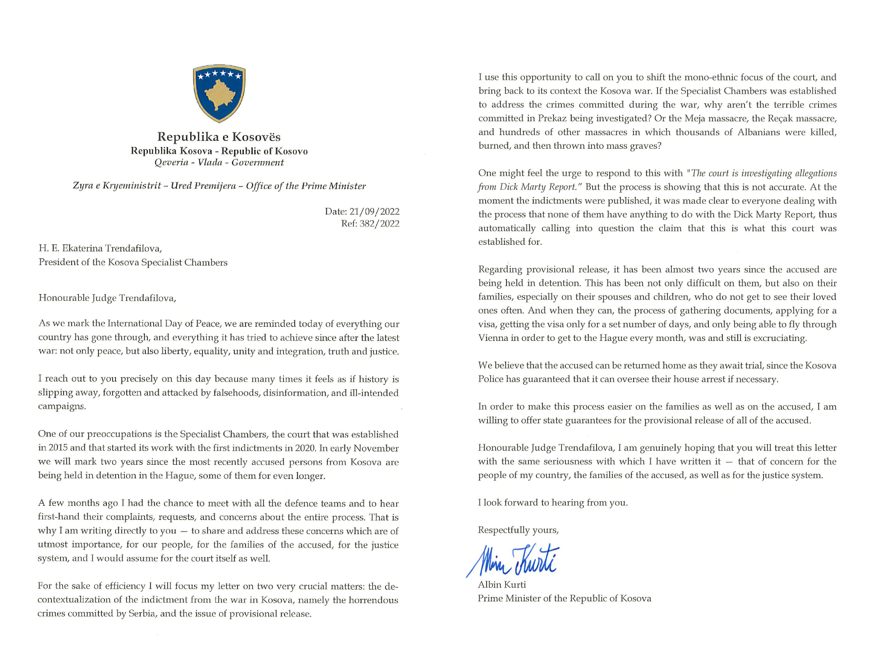Ai ka bërë publike edhe një letër që i kishte dërguar në shtator të vitit 2022 kryetares së Dhomave të Specializuara, znj. Ekaterina Trendafilova, në të cilën kishte kërkuar lirimin e tyre dhe mundësinë që të mbrohen në liri.