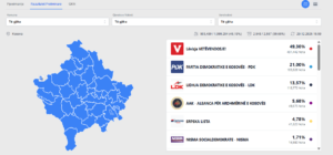 Kur kanë mbetur edhe 9 vendvotime pa u procesuar rezultatet, në 99.65%, Lëvizja Vetëvendosje ka marrë 49.39% apo 431 mijë e 442 vota.