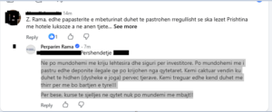 “Ne po mundohemi me kriju lehtesira dhe siguri per investitore. Po mundohemi me i pastru edhe deponite ilegale qe po krijohen nga qytetaret. Kemi caktuar vendin ku duhet te hidhen (dysheke e joga) pervec tjerave. Kemi treguar edhe kend duhet me thirr per me bo bartjen e tyre!!!Per bese, kurse te sjelljes ne qytet nuk po mundemi me mbajt!!”, ka shkruar Rama në koment.