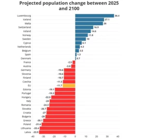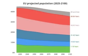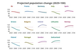 Shkalla e fertilitetit po bie dhe popullsia po plaket në Evropë. Parashikimet e fundit nga Eurostat tregojnë se popullsia e BE-së pritet të bjerë me 11.7% midis viteve 2025 dhe 2100.