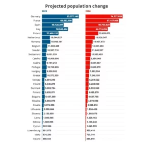 Ndryshimi i parashikuar i popullsisë në të gjithë Evropën ndryshon shumë. Disa vende do të kenë popullsi më të mëdha në vitin 2100 krahasuar me vitin 2025, ndërsa shumë të tjera do të shohin rënie.